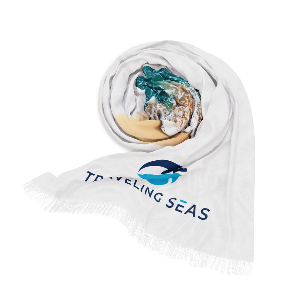 A breezy, ocean-inspired scarf that feels like an instant escape. Lightweight and semi-translucent, the long white field is punctuated by a photographic shoreline and soft turquoise surf along one edge, with a small travel-themed emblem near the corner. Wear it draped around your neck, tied to a bag, or over your shoulders on sunlit mornings — it brings a beachside hush wherever you go. The fabric’s soft hand and vibrant print keep the colors lively without feeling heavy. This scarf slips easily into a weekend bag and layers cleanly with linen shirts, sundresses, or a light jacket when the evening breeze rolls in.